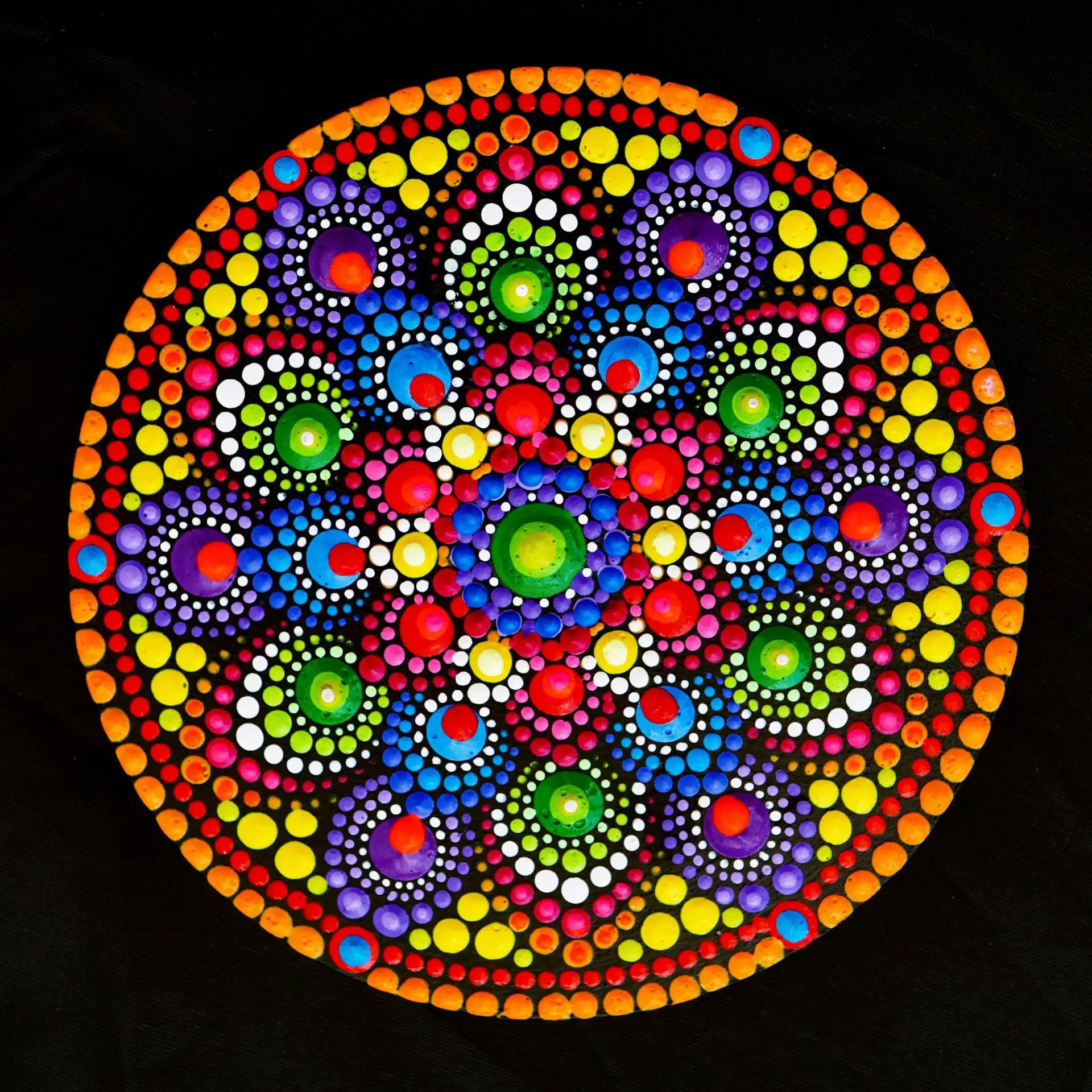 La palabra Mandala proviene de la lengua sánscrita y significa círculo (más información en el blog). En ese sentido, los cuadros Mandala son lienzos que contienen diagramas simbólicos y con un significado espiritual para muchas culturas como, por ejemplo, la budista e hinduista. Hay varios tipos de Mandala como los hindúes, budistas, los bön y cósmicos. Para pintarlos, se utilizan diversos métodos. En este caso, Cristina Flores utiliza la técnica del puntillismo.