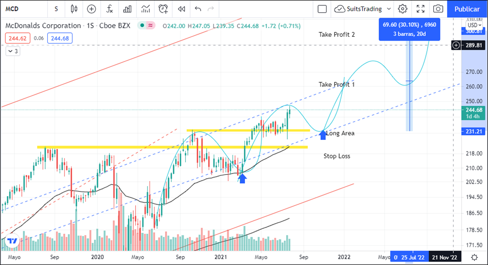 El precio viene trabajando históricamente en doble canal alcista y se perfila en el medio de los dos canales dando una visión clara de continuación alcista. Por lo tanto, usamos lectura de ciclos y secuencias ascendentes que buscan máximos y mínimos mayores. De esta forma, cualquier retroceso a niveles de 230 dólares que respete el nivel de soporte creado en octubre de 2020 como el máximo de ese año y que confluye con la directriz alcista del canal interno, será oportunidad de tomar la siguiente secuencia con objetivo inicial de 260 dólares y de quebrar ese nivel creando un nuevo soporte, seguramente buscará el nivel psicológico de los 300 dólares por acción lo que supondría un 30% de rentabilidad a lo cual no le daríamos más de los 217 dólares como nivel de stop loss.