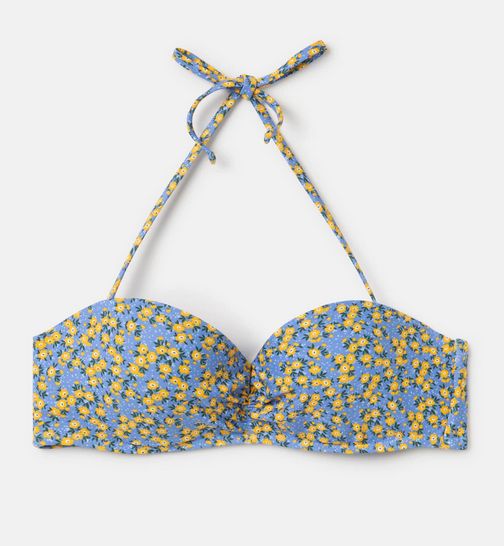 Si buscas un top de bikini que realce tu escote, también lo puedes encontrar en El Corte Inglés. Este modelo de la marca Easy Wear tiene un diseño bandeau con un bonito escapando floral en tonos amarillos, tirantes desmontables y forma push up, para moldear la apariencia del busto. Está fabricado con fibras recicladas, en poliéster y elastano y tiene una interesante rebaja del 44%. Su precio actual es de solo 9,99€. Puedes utilizarlo con la barquilla a juego o combinarlo como tú quieras. Aquí te dejamos el link.