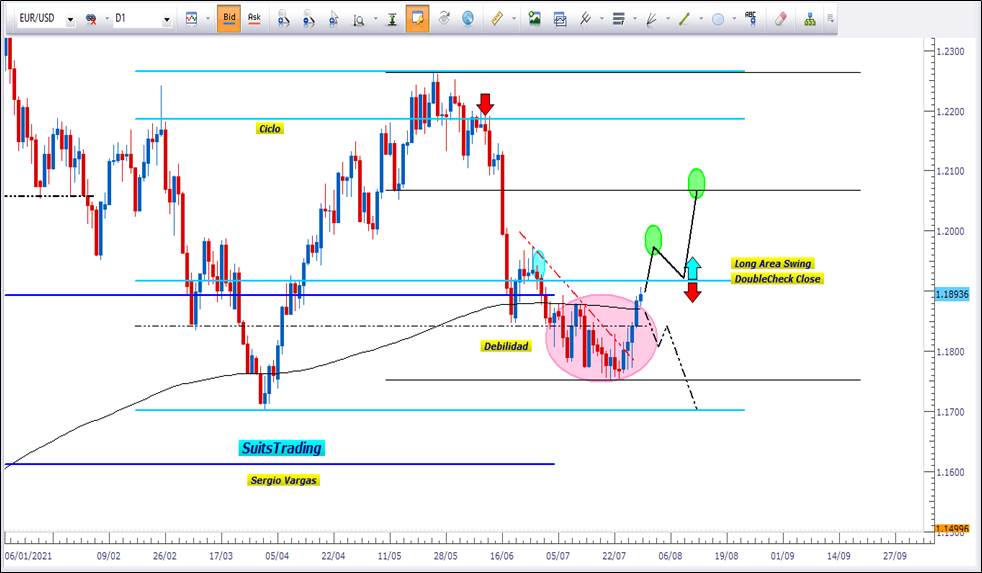 Técnicamente, el gráfico diario del EURUSD ha venido realizando un cierre de ciclo el cual para junio de 2021 realiza el movimiento de presión bajista perdiendo así los 1.2000 para ir hasta 1.17600, precio en los que se ha mantenido durante todo el mes de julio creando a su paso lo que conocemos como una debilidad, ya que el precio no ha tenido la suficiente fuerza de caer hasta los mínimos anteriores ubicados abajo de 1.1700.