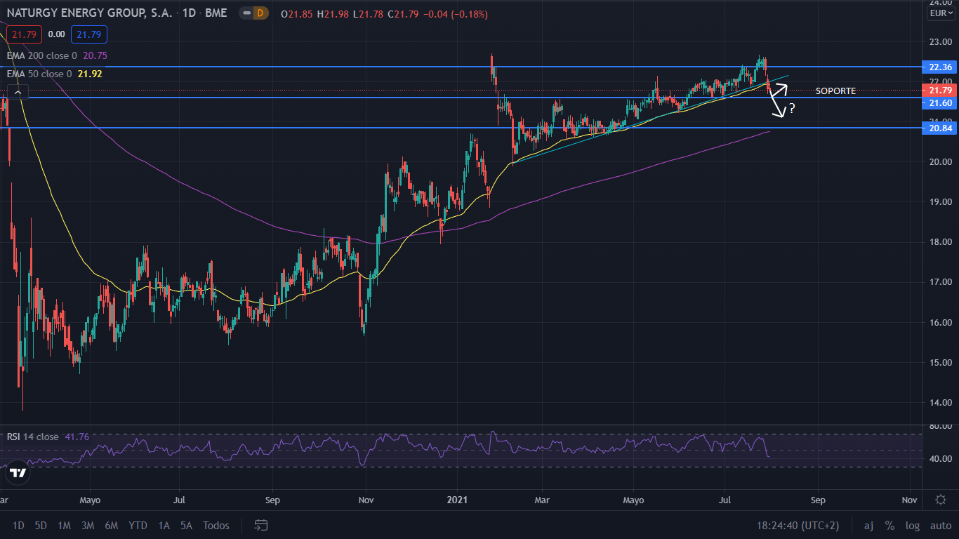 Tras dicho gap, el precio bajo hasta colocarse nuevamente en la tendencia. Actualmente, tras alcanzar los 22,61 euros por acción, el precio se encuentra bajista desde la publicación de los resultados del semestre, donde ha perdido la tendencia de los últimos 6 meses. Para el corto plazo, Naturgy iría a buscar el soporte 21,60 euros por acción, donde con probabilidad podría rebotar a alcista para ir a buscar la tendencia nuevamente. Como escenario bajista, si al situarse el precio en los 21,60 pierde dicho soporte, iría a buscar los 21,14 e incluso el soporte de los 20,84, donde versamos si vuelve a alcista o inicia una nueva tendencia a bajista.