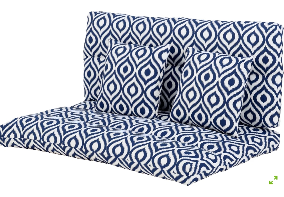 Está fabricado en algodón, con diseño geométrico en tono azul y blanco. Con un relleno de espuma para mayor comodidad y resistente para estar en terrazas o jardines gracias a su tratamiento impermeable que repele el agua. Sus medidas son d 120x16x80 cm de ancho, alto y largo respectivamente.