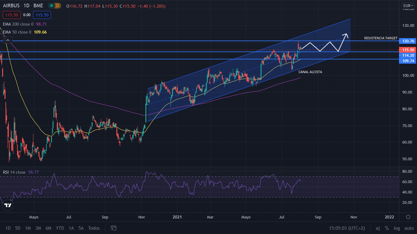 A nivel técnico, desde el mínimo marcado por la pandemia en los 47,48 euros por acción. Airbus se mantuvo lateral hasta que en mayo crecía un 80% hasta los 84,16, donde nuevamente se establecía lateral. En noviembre creció fuerte otro 50% donde hasta hoy se mantiene en una formación de canal alcista. Actualmente su precio acaba de realizar otro impulso dentro de dicho canal. Para el corto plazo de continuar dentro de la formación del canal y repitiendo el patrón de fase de acumulación e impulso, el precio iría lateral entre los niveles 114 y 120, hasta acercase a la parte baja del canal, donde repetiría con un impulso alcista, haciendo que el precio de Airbus se sitúe por encima de los 120 euros por acción para septiembre-octubre, esta continuidad en sus precio iría acompañado de unos buenos resultados para el tercer trimestre de 2021.