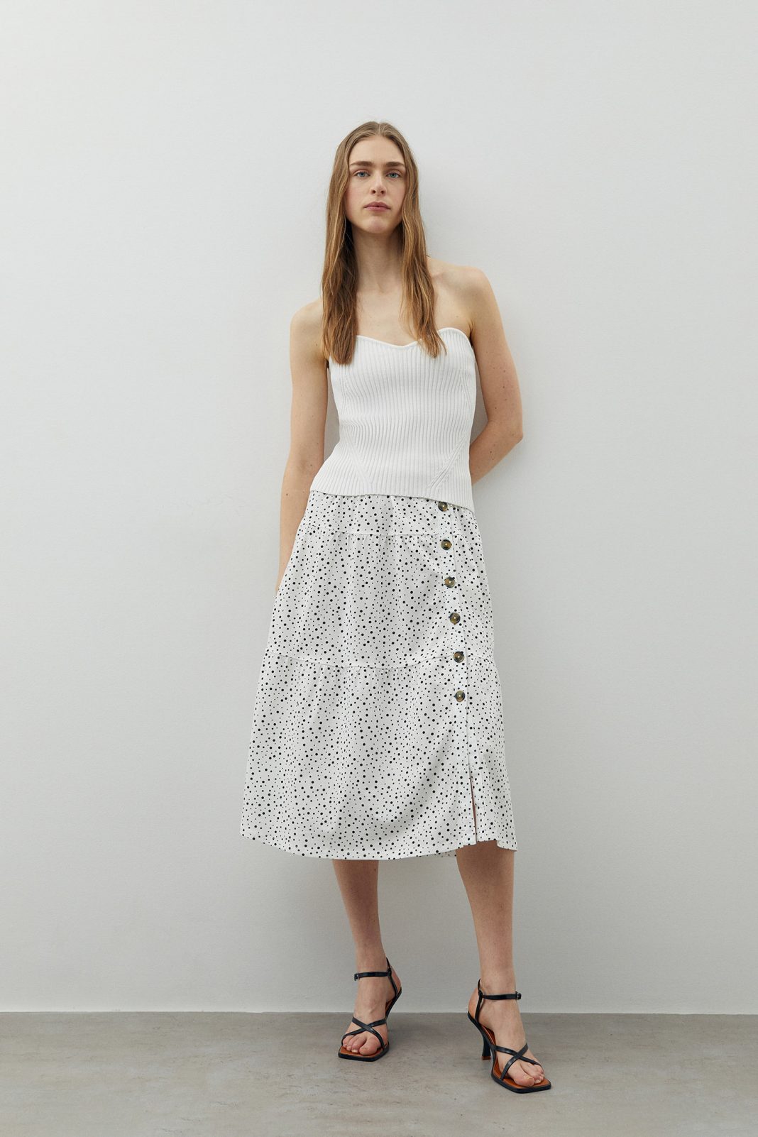 En Sfera encontrarás esta falda volante botones, especial para este verano. Fresca y cómoda, en tamaño midi, estampada con volantes y un especial toque de glamour con sus botones en su parte lateral.