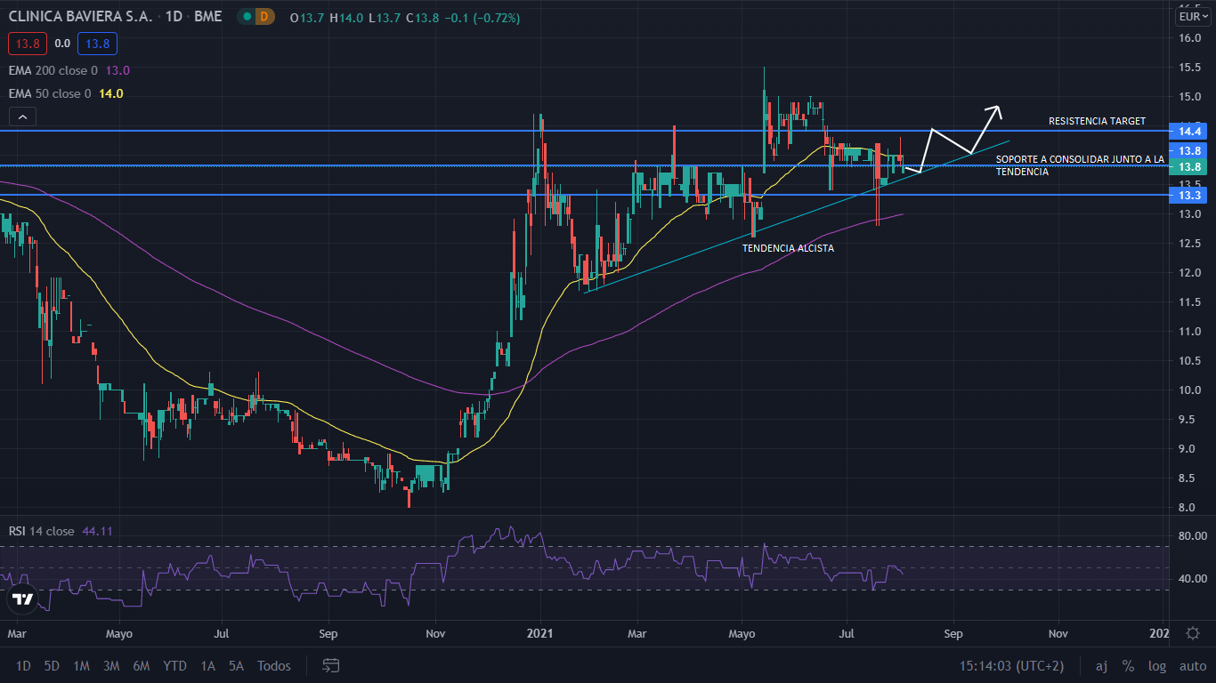 A nivel técnico, desde el mínimo marcado por la pandemia en los 10 euros por acción, su precio continuo bajista perdiendo un 20%, colocándose en los 8 euros por acción. Desde dicho mínimo, en noviembre su precio subió un 85% para después caer hasta los 11,7 euros por acción. Desde dicho nivel, Clínica Baviera se encuentra en una tendencia alcista, en la que lleva desde hace 7 meses.