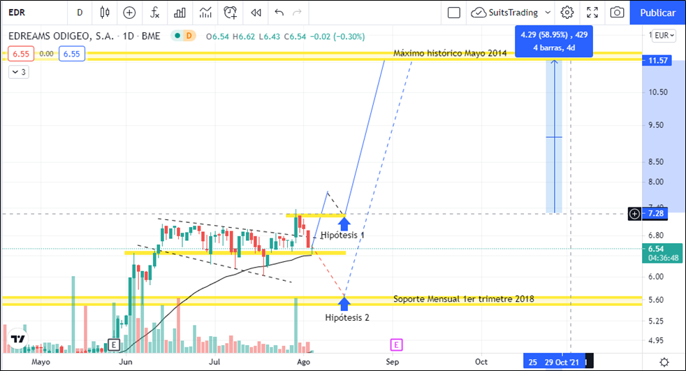 La segunda hipótesis hace referencia a un impulso alcista desde donde está actualmente apoyándose en el último soporte de marco diario en 6,4 euros por acción. Desde ese nivel haría máximos crecientes de los cuales a modo de pullback se apoyará en el último soporte que realizaría para el 30 de julio en niveles de 7,2 euros por acción con el fin de ir a buscar los máximos históricos de mayo de 2014 sobre los 11,5 euros.