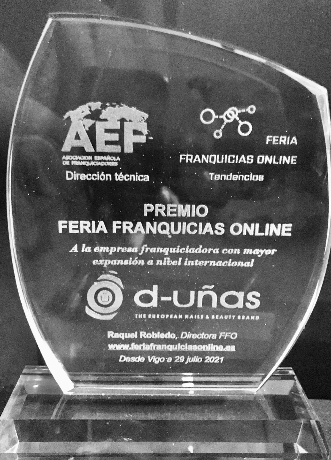 La cadena d-uñas, líder mundial franquiciando negocios de belleza, recibe el premio a la empresa franquiciadora con mayor expansión a nivel internacional. El galardón es otorgado por la Feria de Franquicias Online, bajo la dirección técnica de la Asociación Española de Franquiciadores.
