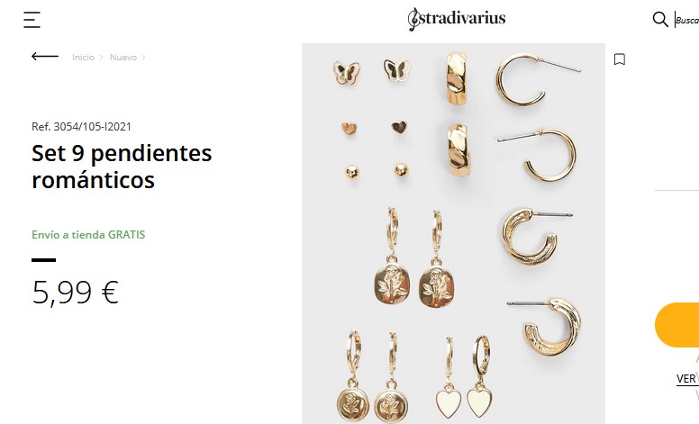 Este set de 9 pendientes románticos ofrecido por esta tienda es otra de las grandes novedades para las mujeres. Dado que, cuenta con una colección de pendientes diferentes que pueden usar en cualquier ocasión o estilo de ropa. Por lo que, se ha convertido en una de las grandes ventas por la plataforma, e inclusive está elaborado con un 90% de zinc y un 10% de hierro. Además, no debemos lavar, no usar lejía ni blanqueador, menos planchar ni limpiar en seco. Entonces, si deseas comprar esta hermosa colección de pendientes solo debes entrar a Stradivarius a un precio de 5,99 €.