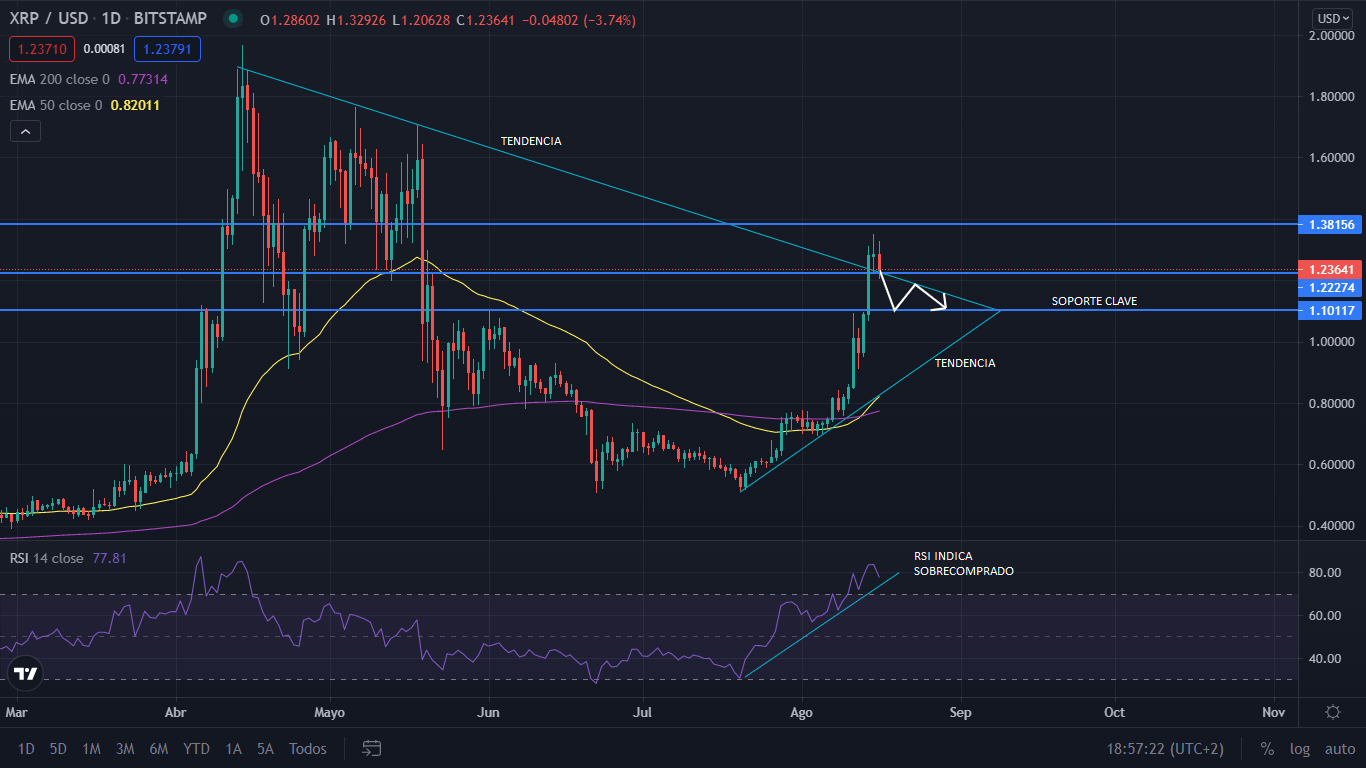 Centrándonos en XRP, a nivel técnico, viendo su estructura, podemos ver varios indicadores de que podría caer hasta el soporte 1,10 USD. Uno de los factores que podemos ver, es que el precio se ha encontrado con la línea de tendencia bajista que se forma desde el máximo alcanzado en abril, y que la línea de tendencia alcista se ha separado demasiado del precio. Además, XRP ha subida mucho en poco tiempo, por lo que se ha separado demasiado de las medias móviles, y a su vez, el indicador RSI se encuentra en niveles de sobrecompra. Todo esto apunta a que XRP va a corregir con gran probabilidad. Pero que esta vez ya no perdería el 1 USD, si corrige de forma controlada y no hay un aumento de la oferta, debido a ventas en masa. Además hay que tener en cuenta que el precio se apoyaría en la línea de tendencia alcista.