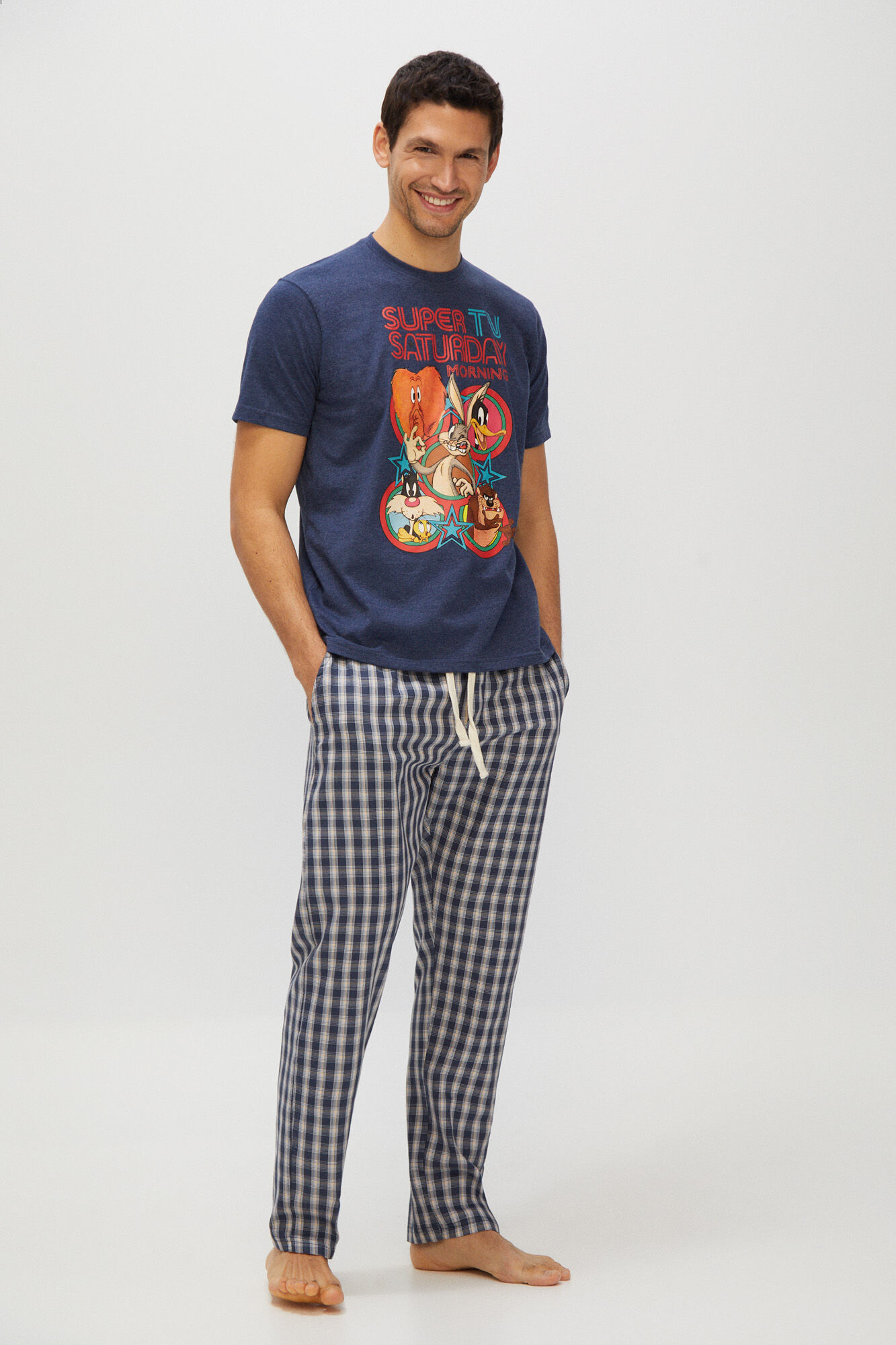 Para estar cómodo en la cama o quedarse un domingo en casa viendo televisión, Cortefiel tiene en sus tiendas el pijama preciso para estas ocasiones. La pijama de punto y tela Looney Tunes, viene en dos piezas, su camiseta manga corta de punto lisa con vistoso estampado de los personajes de Looney Tunes y un pantalón largo en tela a cuadros.
