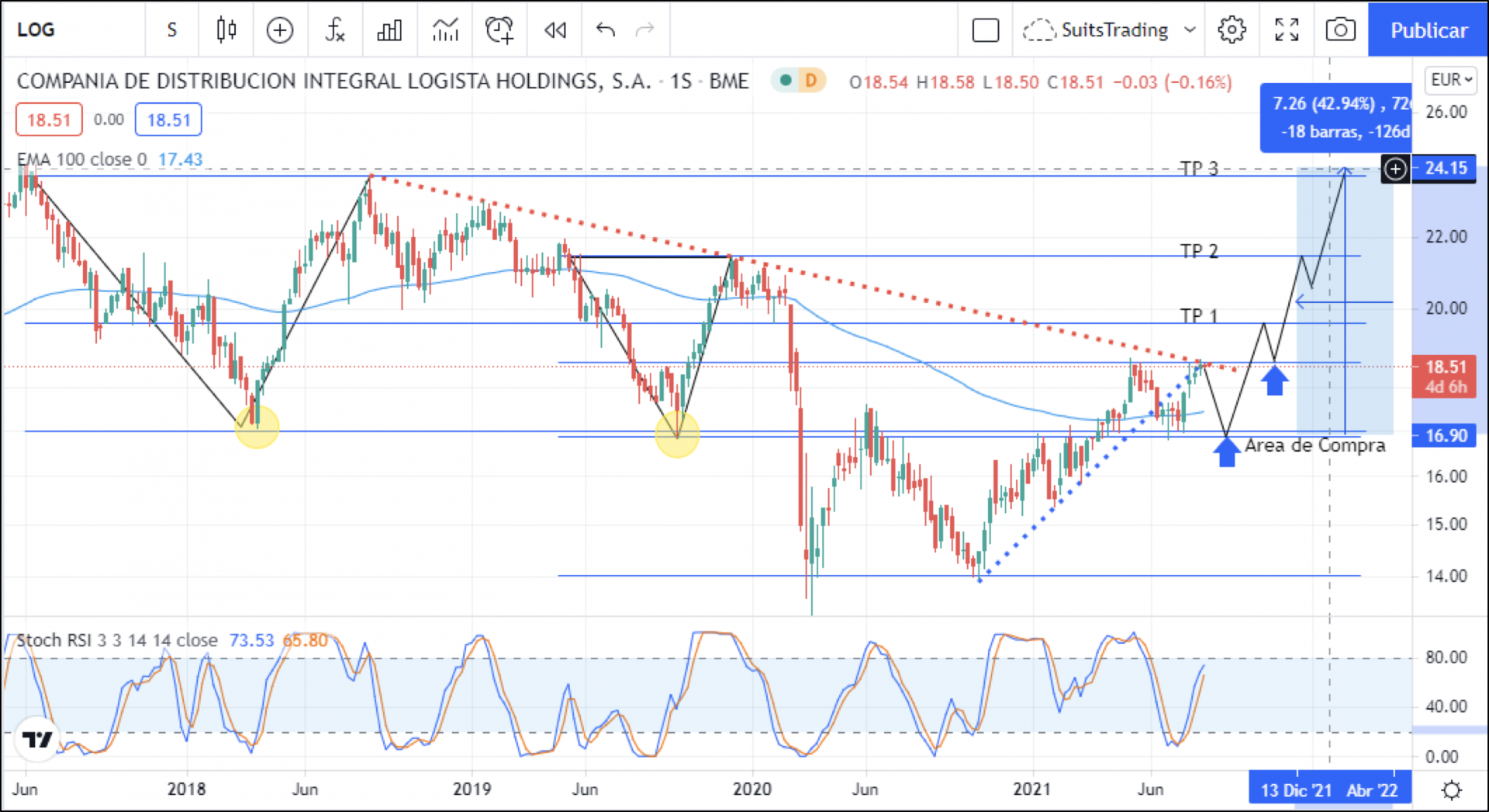 En este momento el precio se encuentra respetando la directriz bajista y los niveles de índice de fuerza relativa se encuentran cercanos a la sobrecompra. Es probable que el precio quiebre esa directriz y continúe su movimiento al alza. Sin embargo, estadísticamente la mayor probabilidad del movimiento del precio es a un retroceso en áreas de 16,9 euros por acción lo cual es el nivel del vértice de ambos cierres de ciclo que se convierten en zona de soporte. Asimismo, impulsaría a la baja el índice de fuerza relativa de manera tal que una vez el precio se encuentre en dichas áreas y trabaje por encima de la media móvil exponencial de 100 periodos, ejerza la presión alcista para llevar el precio a los 3 objetivos establecidos.