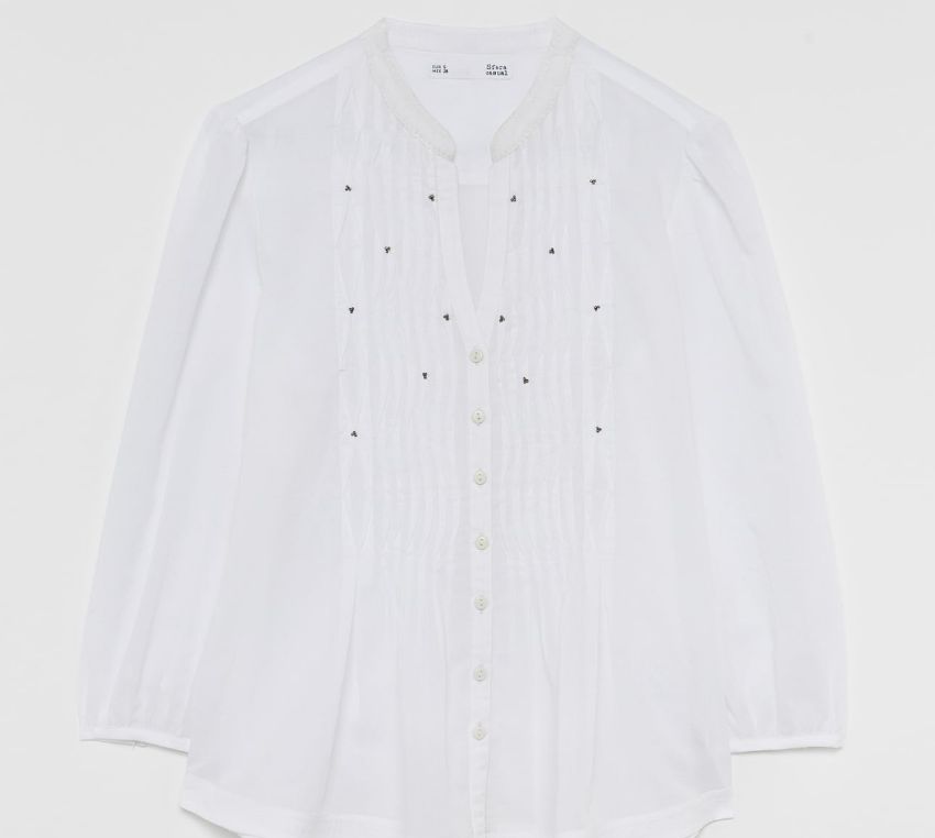Otra de las opciones, si estás buscando una camisa blanca con la que ser la más bonita de la fiesta, es esta prenda que tienen a la venta en Sfera. Se trata de una camisa tipo pechera que tiene el cuello abierto y una manga semilarga. Además también destaca por tener una bonita caída que dará mucha fuerza y personalidad a tu look. Su precio es de tan solo 9’99 euros.