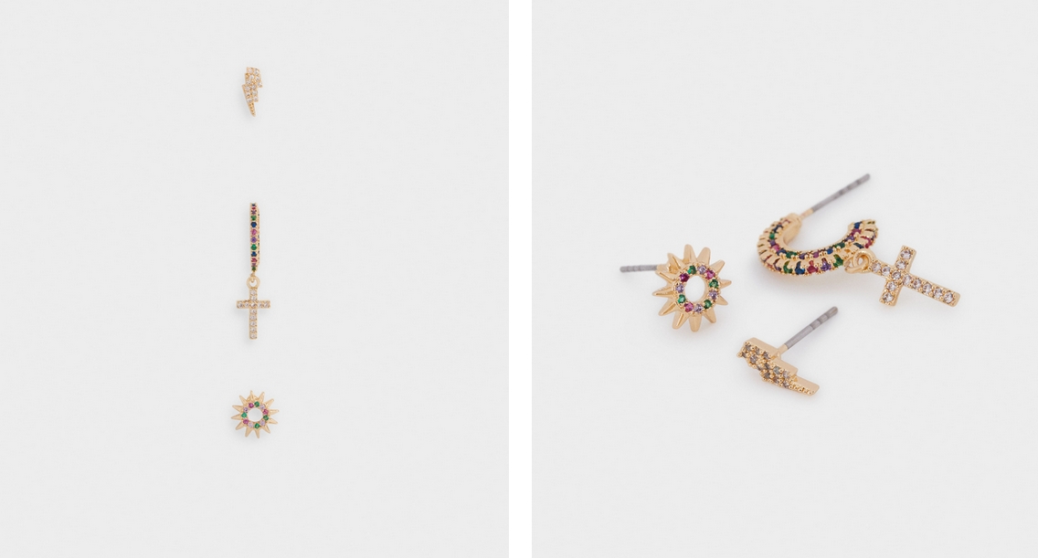 También tienes a tu alcance otro conjunto de aros cortos con charms y circonitas. El precio de Parfois es de 5,99€, ya que ahora se encuentra rebajado. Solo disponible en un único acabado, a diferencia del anterior conjunto: el dorado.