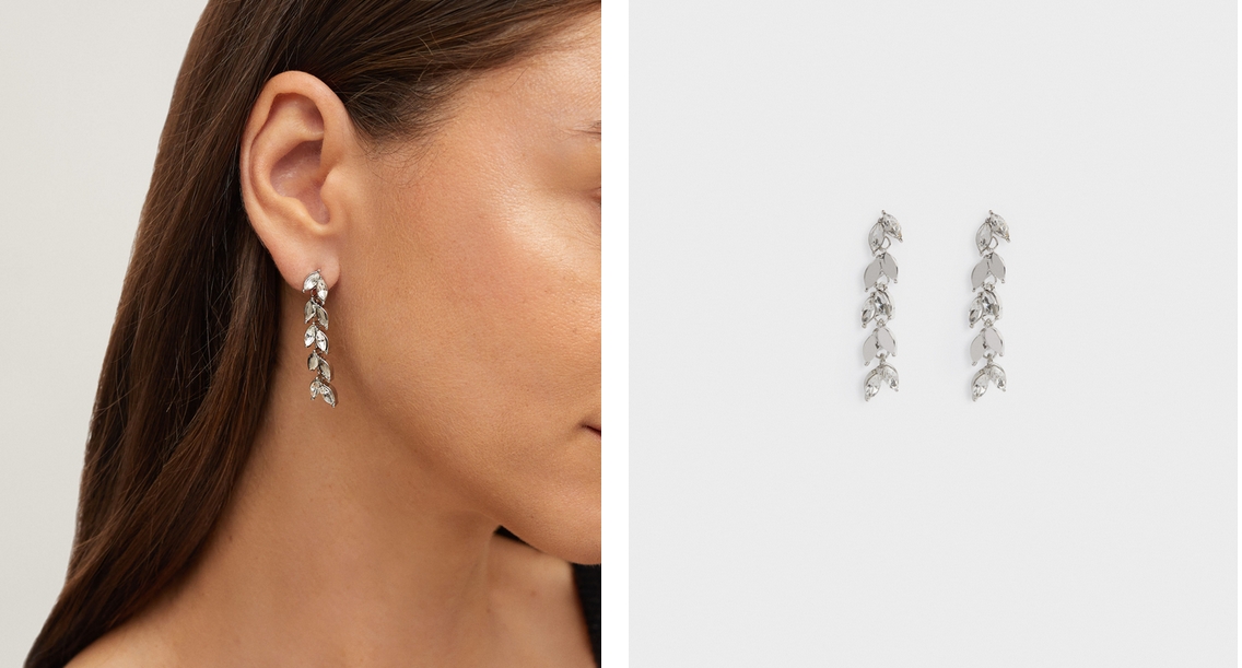 Para crear esta pieza tan elegante y distinguida se han empleado materiales como un 10% de hierro, 60% de zinc para la aleación, y un 30% de vidrio para los brillantes que adornan los pendientes. En cuanto a su forma, se ha elegido una inspirada en la naturaleza, con detalles de hojas…