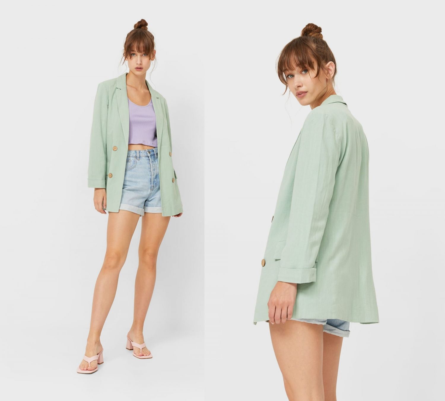 El siguiente modelo es este blazer rústico abierto de Stradivarius. Por 29,99€ lo encontrarás en varias tallas y en un tono de acabado verde suave. Está confeccionada en 79% viscosa y 21% lino, para darle un acabado mucho más fino y delicado, además cuenta con un forro de poliéster y algodón.