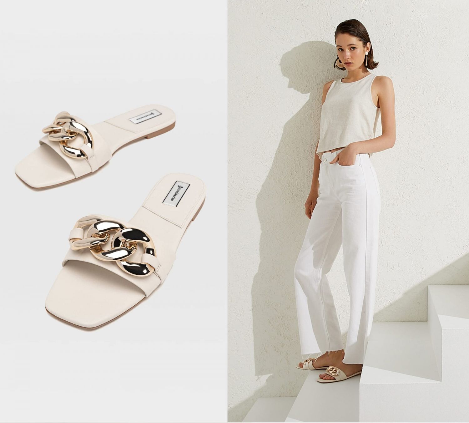 Otra de las alternativas que puedes adquirir en Stradivarius son estas otras sandalias planas con cadena. Disponibles en acabado en crudo, como el de la imagen de la modelo, y también en negro. En cualquiera de sus tallas están a la venta a 25,99€.