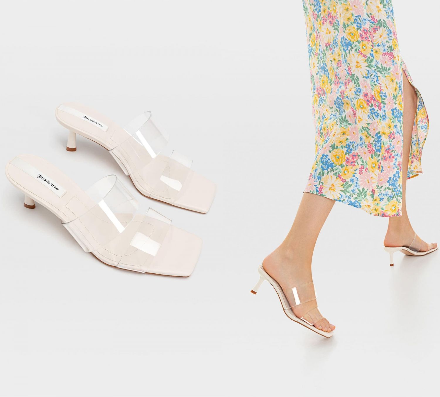 Por último, otro de los diseños más distinguidos, elegantes y finos de Stradivarius es este. Unas sandalias de tacón de vinilo y doble tira. Disponibles en diversas tallas y en tono crudo que resulta muy combinable.