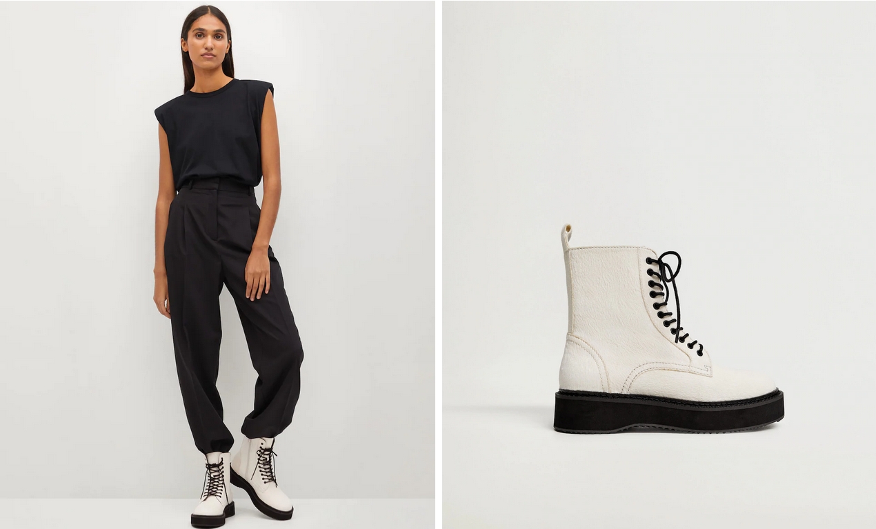 El siguiente diseño es algo más moderno y atrevido. Son unos botines de piel con cordones. Mango ha jugado en este diseño con el contraste, y el resultado es bastante interesante. Su precio es ahora de 45,99€ tras rebajarlos un 54%.