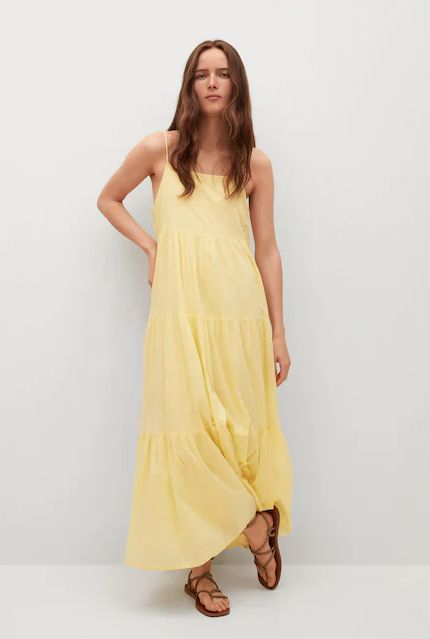 Los vestidos sencillos y minimalistas, son la mejor opción para pasar los días más calurosos del verano sin sacrificar estilo y elegancia. En Mango podemos conseguir un look perfecto y fresco con este bonito maxivestido vestido de algodón 100% de origen sostenible, muy fluido y suave, con escote recto y tirantes muy finos. Tiene un corte acampanado con volante en el bajo, y está disponible en dos colores, amarillo y verde, en tonos que destacarán el color bronceado de tu piel. Tiene una rebaja del 25% y su precio es de 29,99€.