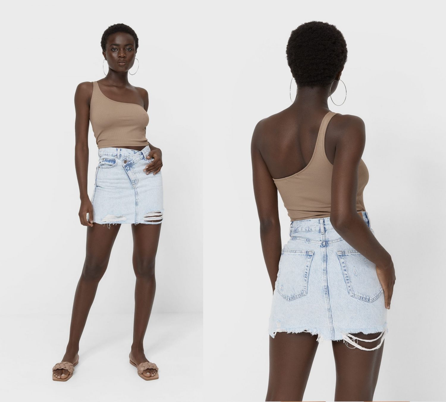 Al igual que la prenda anterior, esta falda también se ha confeccionado en fibras 100% algodón. Su diseño es estilo denim, con tiro alto, cinco bolsillos, detalle de rotos y bajo acabado sin costura, y una cintura asimétrica.