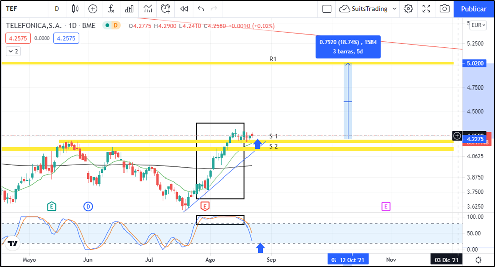 Una vez el precio quiebre los 5 euros, muy posiblemente irá a buscar niveles de 5,4 euros donde confluye con la directriz bajista macro que viene trabajando desde sus máximos históricos. Esta operación supone una rentabilidad superior al 17% para un corto plazo. Por lo tanto, estaríamos atentos a cualquier buena nueva de parte de telefónica.