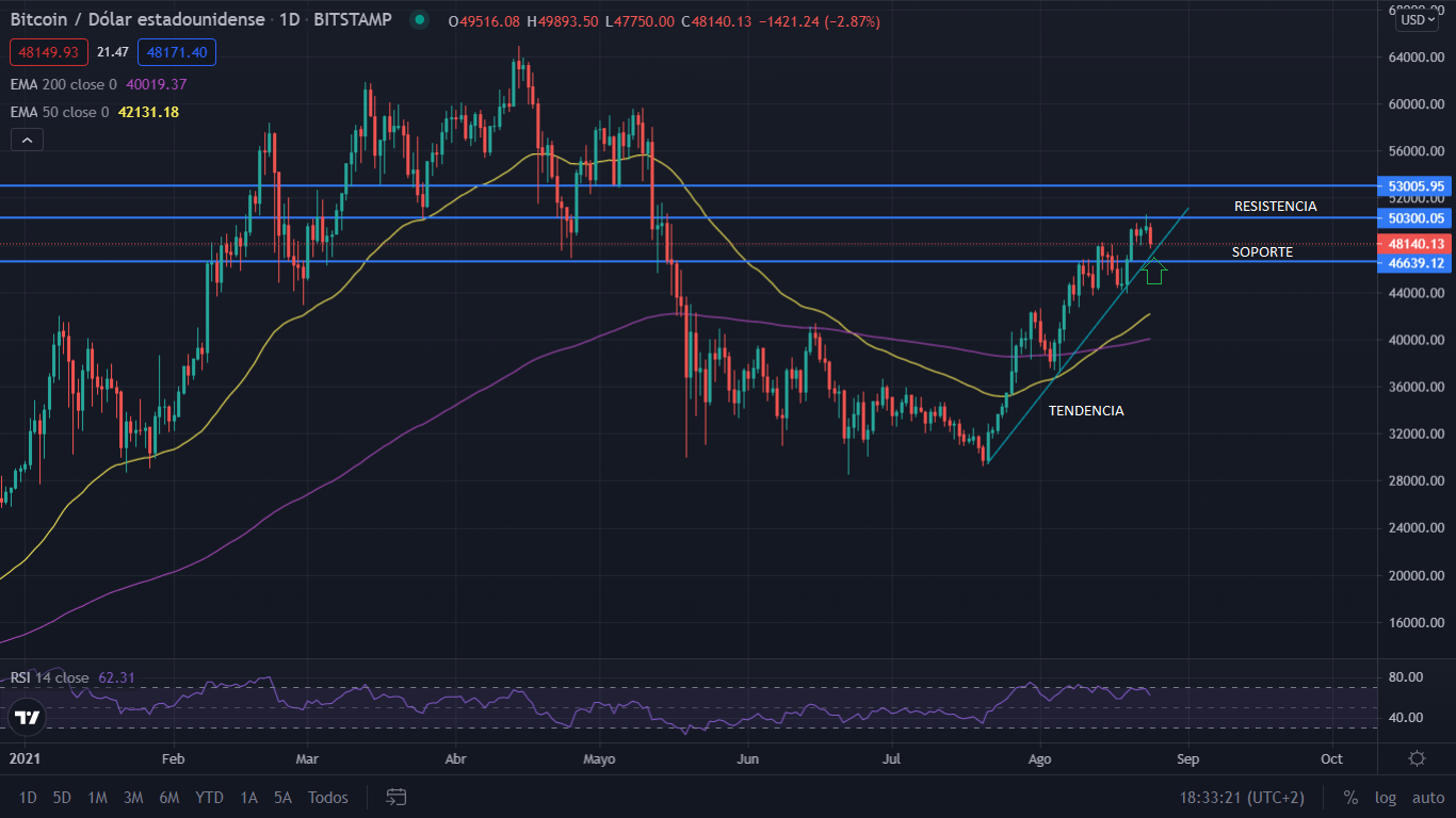 A nivel técnico, desde la caída de todas las crytos en mayo, Bitcoin alcanzo los 29.000 USD. Tras ese mínimo alcanzado con la tendencia bajista, BTC rompió a alcista, recuperando los 40.000 en 9 velas verdes. Actualmente BTC ha tocado los 50.000 USD y se encuentra retrocediendo a la línea de tendencia. Para el corto plazo, de continua la tendencia alcista y la presión alcista continua, llevaría a BTC a los 53.000 USD antes de iniciar una corrección más notoria, ya que el indicador RSI se encuentra en zona alta, desde hace semanas. A pesar de que los indicadores técnicos marquen posible corrección, la volatilidad de BTC siempre puede sorprender.