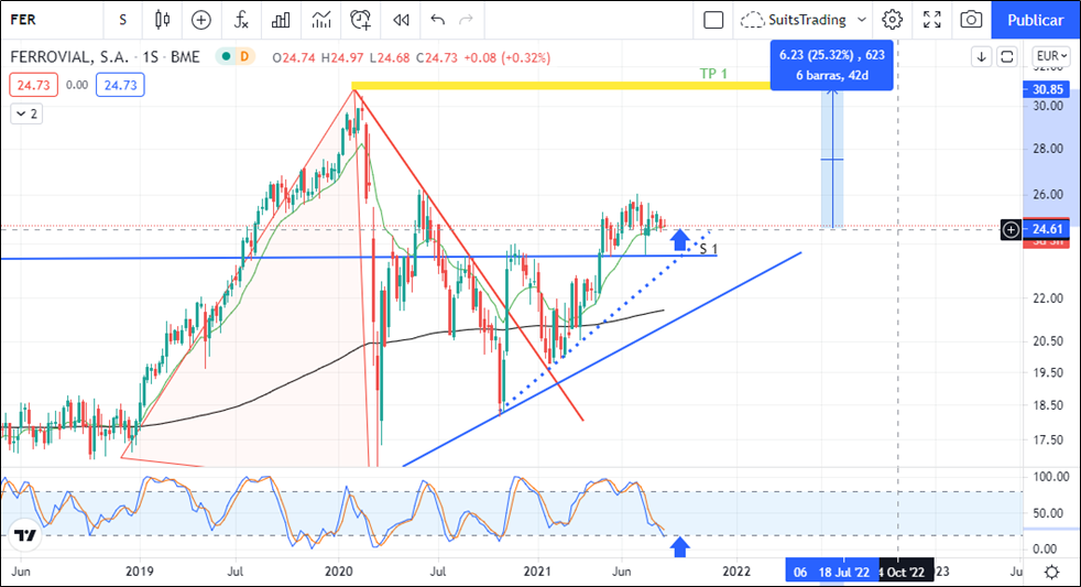 El precio está respetando al pip el soporte más importante de octubre de 2015 (S1), el cual al mismo tiempo confluye con una directriz alcista de marco diario señalada en línea punteada desde enero de 2021 que se apoya en el índice de fuerza relativa que muestra niveles actuales de sobreventa. Es una operación que podría ir a buscar los máximos de 2020 ubicados en niveles de 30,5 euros por acción. Es una operación que representa más del 25% de rentabilidad la cual se puede desarrollar perfectamente para el tercer trimestre de 2021.
