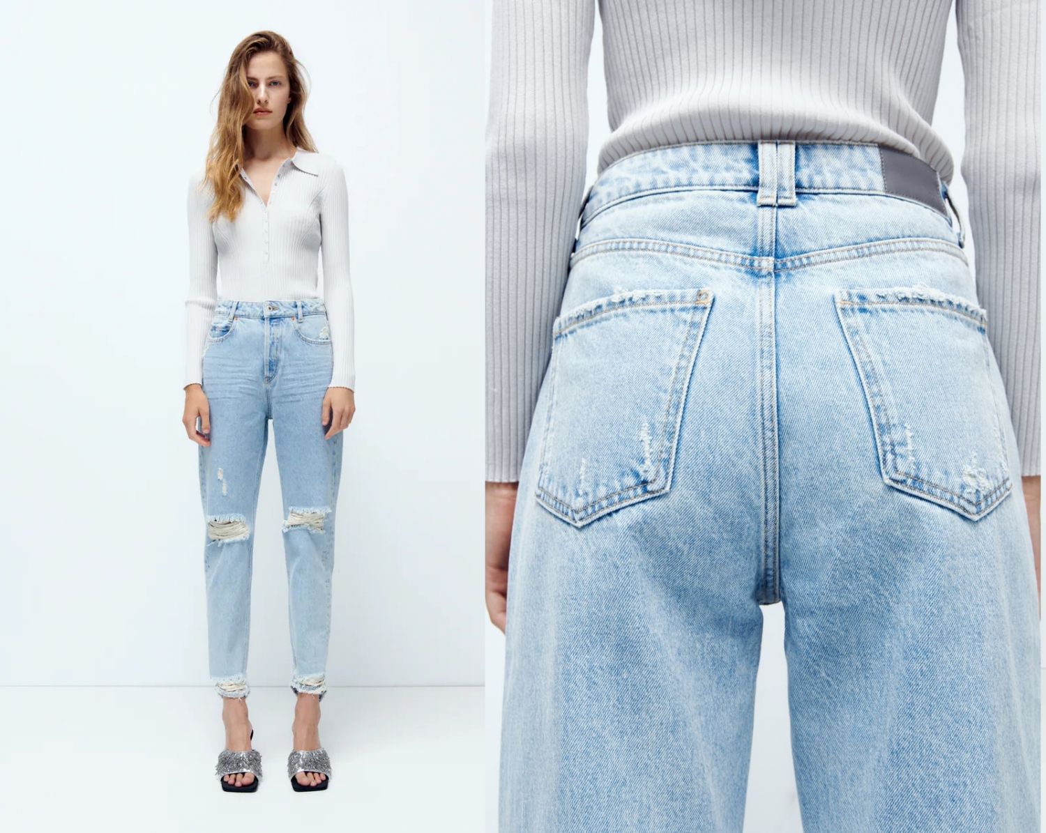 Por último, la tienda Zara también cuenta con estos pantalones jeans mom fit rotos. Una prenda que realmente es atemporal, y que está disponible por 25,95€ en las distintas tallas y en este tono azul claro.