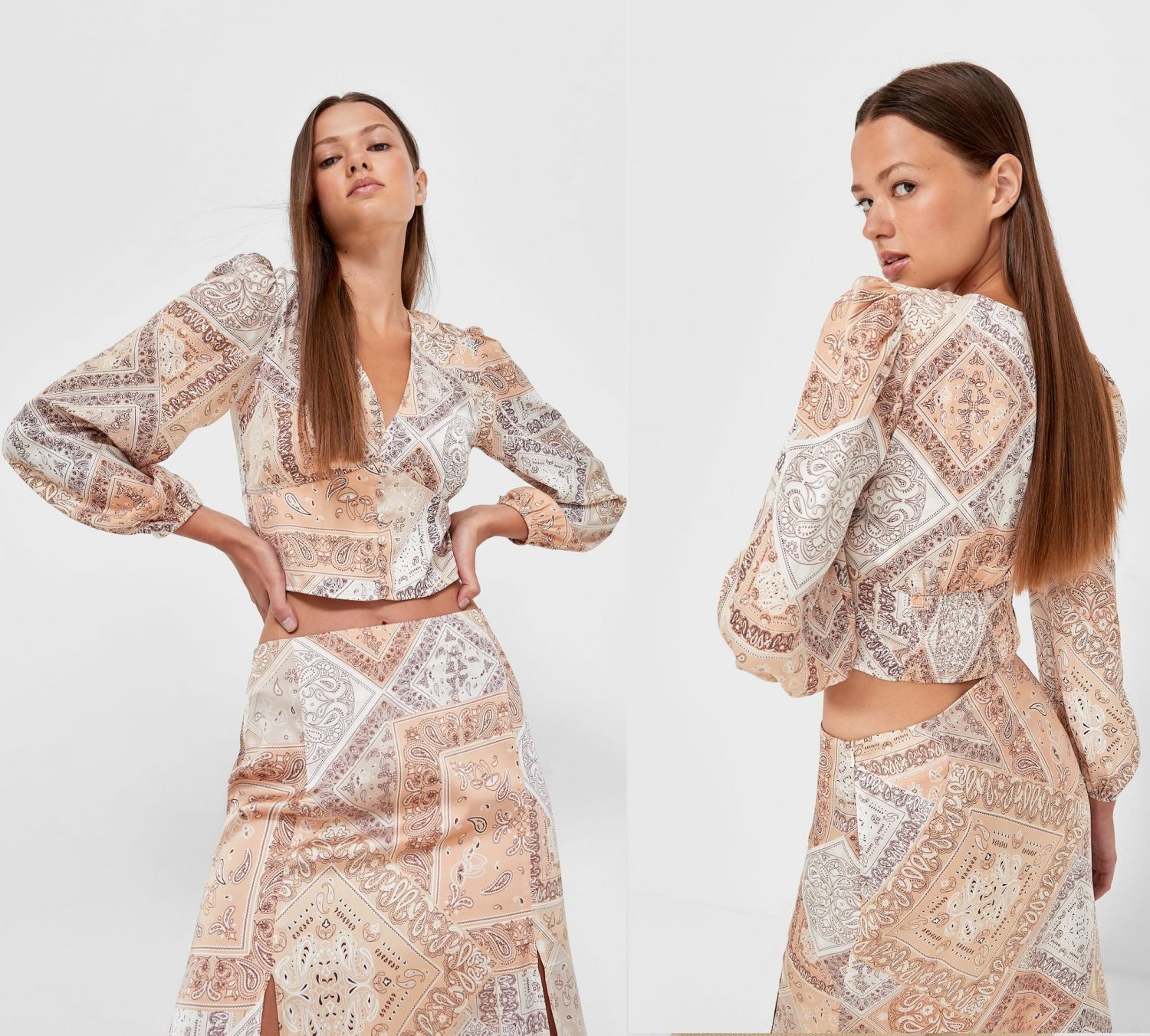 Esta blusa de cuello de pico estampada también se puede combinar fácilmente con otra prenda de Stradivarius y completar tu look otoñal. Cuesta 19,99€ y puedes elegirla en color piedra, como el de la imagen, y en color verde.