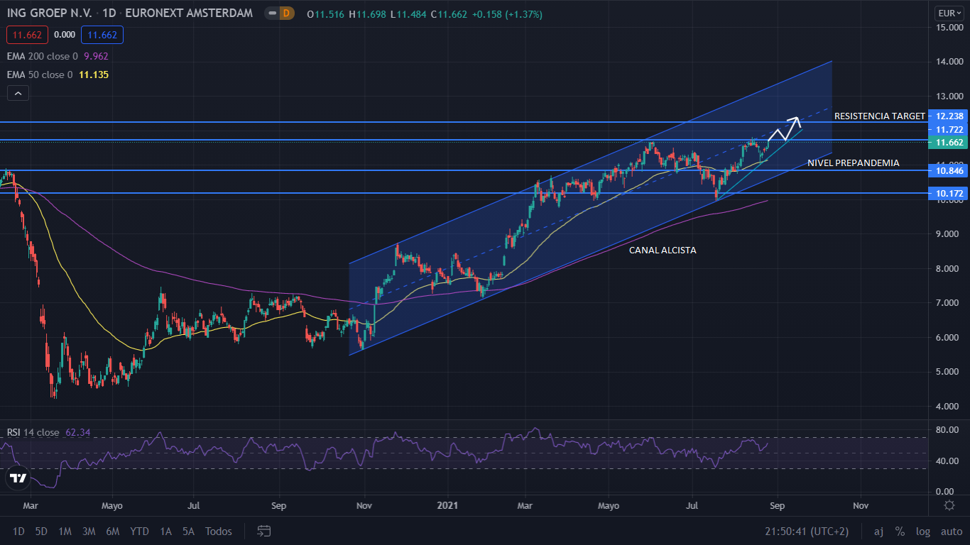 A nivel técnico, desde el mínimo marcado por la pandemia en los 4,20 euros por acción, ING se movió lateral durante dos meses, hasta junio del 2020, que subió y se estableció lateral nuevamente. En noviembre del 2020, inició una tendencia alcista, que pasó a formar un canal alcista, que a día de hoy aún mantiene, acumulando un 107%. En mayo superaba el nivel prepandemia, que lo llevo a retroceder varios niveles, pero que nuevamente recuperó. Actualmente el precio se encuentra en la resistencia alcanzada en mayo.