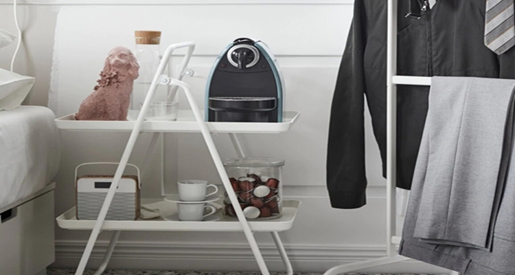 Levantarte por la mañana y tener la ropa preparada, los complementos a mano, o hasta una pequeña cafetera con tazas al ladito de la cama… ¿lo quieres? pues todo esto es posible sin salir del dormitorio, nuestro sueño más buscado. Desde Ikea tenemos piezas tan amplias como este ideal soporte para bandejas que nos permite tener más espacio para poner cosas. Es fácil de mover de sitio y ocupa muy poco.