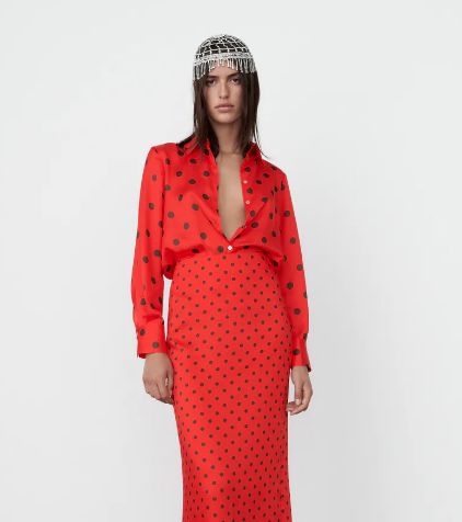 Si están buscando una prenda puntera es más que probable que ya la hayas encontrado. Nos referimos a esta bonita blusa que puedes encontrar en cualquiera de las tiendas de Zara y que está ganado adeptos a millares. Lo primero que llama la atención es su original estampado formado por un fondo de intenso color rojo con lunares azules. Además, también tiene un bonito cuello con solapa, una manga larga que acaba en puño y un cierre frontal con botones. Y otro de sus aspectos positivos es que, al contrario de lo que puede parecer en un primer momento, no se trata de una prenda demasiado cara. Y es que su precio es de tan solo 25’95 euros.