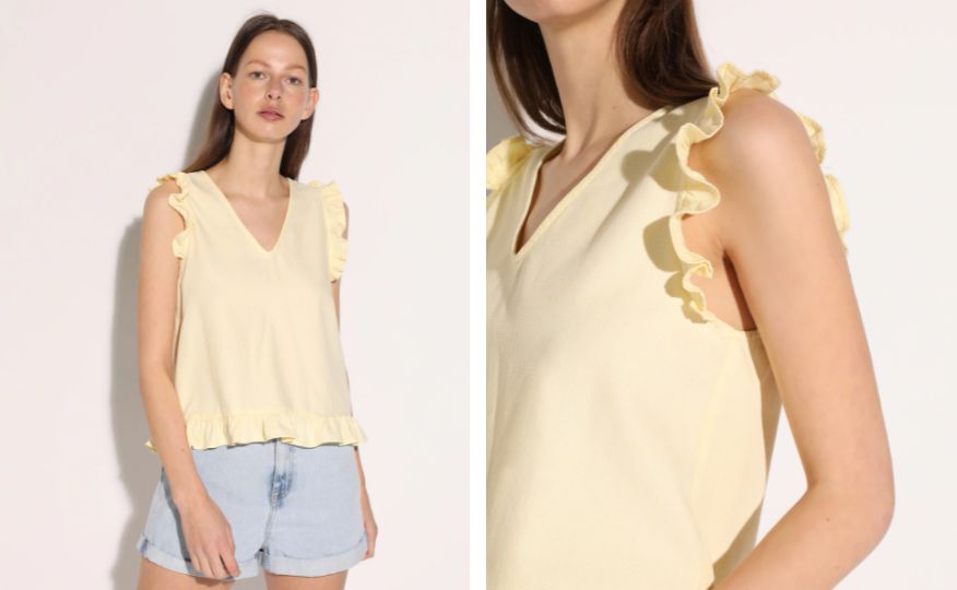 Terminamos con esta blusa, volviendo a lo liso y continuando con Easy Wear. Hablamos de esta blusa de volante en la sisa y sin mangas. Un modelo de lo más veraniego pero que podrás seguir usando combinado y siempre, con fresco, combinando con una bonita chaqueta.