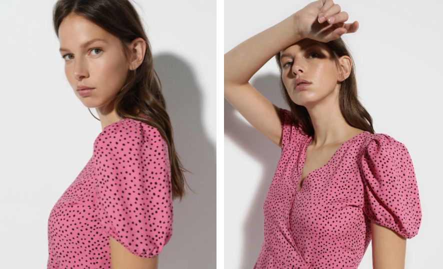 Se trata de una blusa rosa de lunares que tiene cierre cruzado con botones y manga corta. Está hecha también 100% en viscosa y si clicas en este enlace, la podrás comprar a este precio de escándalo.