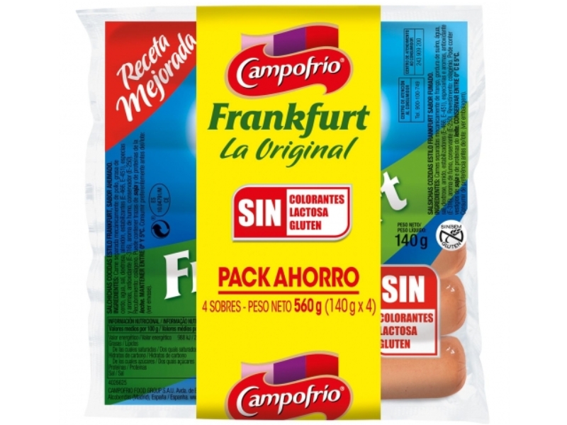Este pack incluye 4 sobres de 140 gramos cada uno (560 gramos en total), con 6 salchichas cada uno. Además, su receta no incluye colorantes, lactosa, ni gluten, para que sea apta para todos los intolerantes.