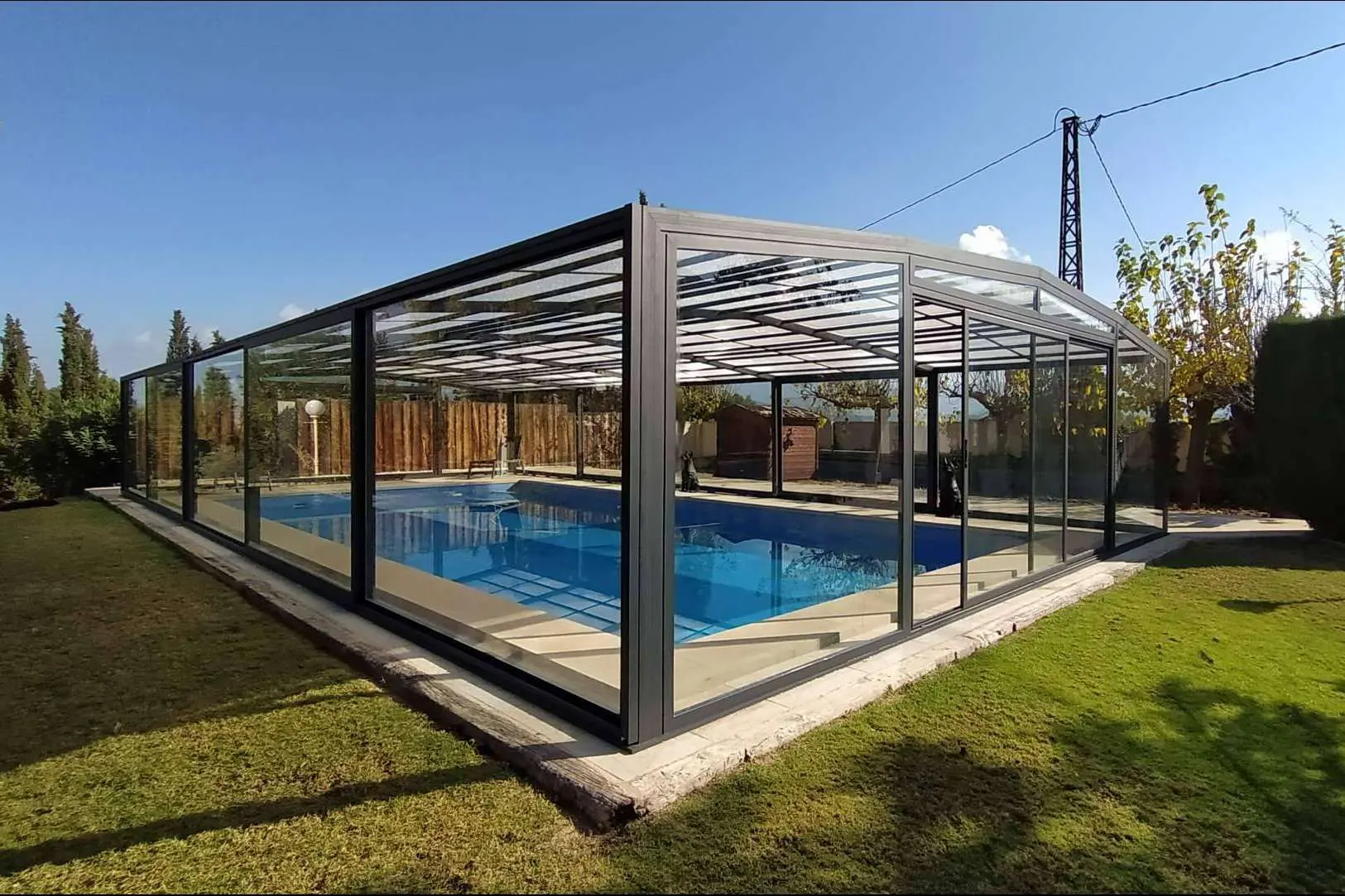 Instalar una cubierta en la piscina sin perder la visibilidad y en completa armonía con todos los detalles del jardín es una de las ventajas de la estructura, tanto de vidrio como policarbonato, con deslizamiento telescópico. Este diseño vanguardista es uno los preferidos por los clientes.