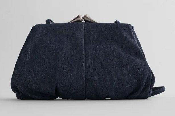 Si el código de vestimenta te lo permite, o si quieres algo diferente para el ‘casual day’, este original bolso es perfecto para el día a día, porque está fabricado con tela vaquera. El cuerpo tiene u detalles de pliegues y lleva un asa larga para llevar al hombro o cruzado, aunque también se puede adaptar como bolso de mano. El interior está forrado y cierra con una pieza metálica. Tanto el cierre como la forma del bolso recuerdan a aquellos monederos que usaban nuestras abuelas, por eso nos ha encantado este bolso. Tiene un precio de 29,95 €.
