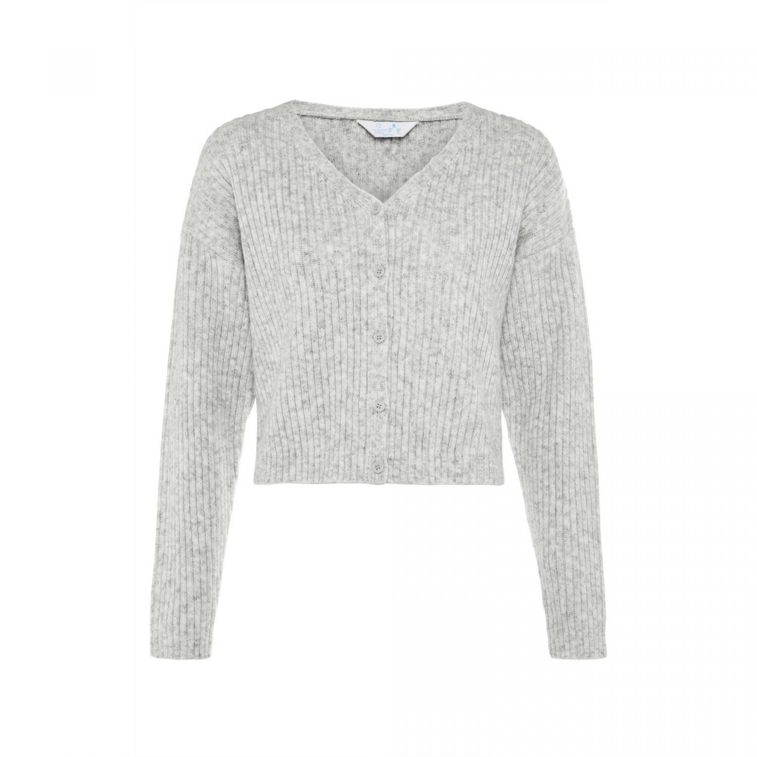 Este cárdigan hace jugo con el top y te permite crear un conjunto que puedes usar tanto para ir a trabajar o estudiar como para salir. Es una chaqueta gris de punto canalé con cuello de pico. Si la llevas desatada, o dejas sin abrochar algún botón, podrás ir mostrando el top que hemos visto antes.