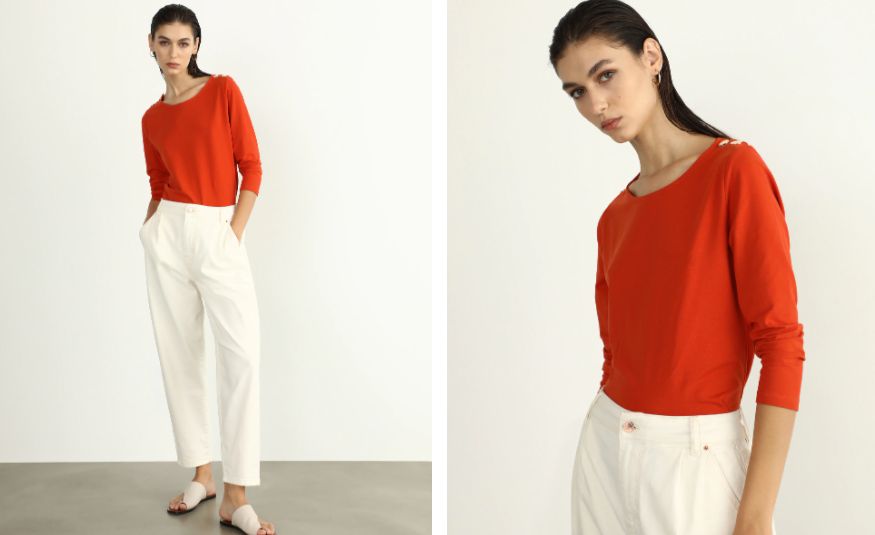 Vamos con un modelo que además está certificado como sostenible, ya que está fabricada dentro de la iniciativa Better Cotton. Si, está hecha casi 100% en algodón, pero ecológico. Se trata de una camiseta de manga francesa con cuello barco y detalle de botones dorados en los hombros. Es una camiseta cómoda y versátil confeccionada en un tejido elástico y no puede faltar en tu armario porque puedes combinarla con todos tus looks. Será tu favorita de la temporada, también por su precio de 15,99 euros. En este enlace será tuya.
