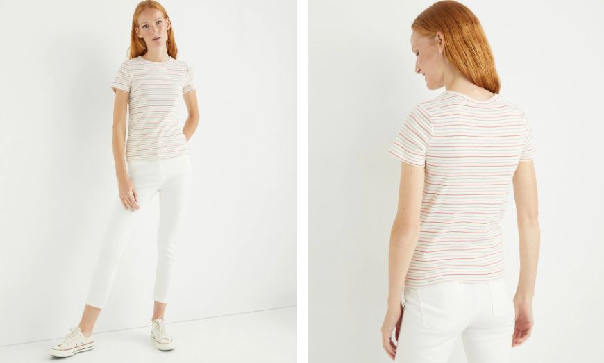 Bajamos el precio bastante, hasta los 19,90 euros, para esta novedad de Esprit en El Corte Inglés. Se trata de una camiseta de manga corta, cuello redondo y con rayas multicolor slim fit, para ir de lo más veraniega todo el año. Se vende solo en color blanco y está fabricada enteramente en algodón y además ecológico. Como ves combina con todo, pero queda perfecta con un pantalón blanco y zapatillas casual. A qué esperas para comprarla en este enlace que te dejamos.