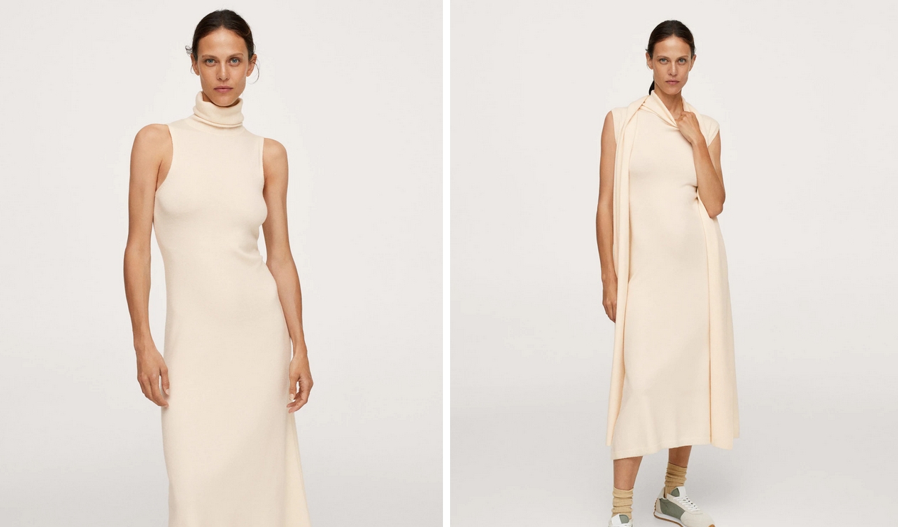Mango también cuenta con un vestido de punto de cuello vuelto muy fino y minimalista como este. Lo puedes elegir en varias tallas, aunque solo está disponible en un tono vainilla. Un color muy atractivo que podrás conseguir por solo 29,99€.
