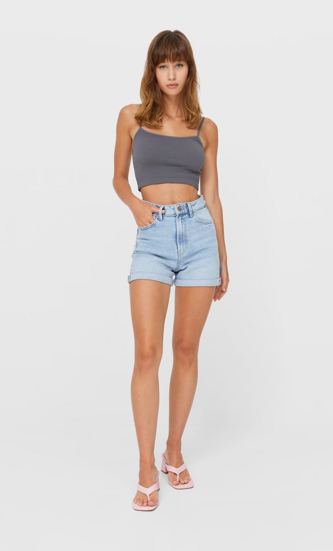 Este delicado short mom slim que tienen las tiendas Stradivarius, está confeccionado para la dama joven activa y motivadora de hoy. Elaborado en tiro alto y bajo terminado con vuelta y cinco bolsillos.