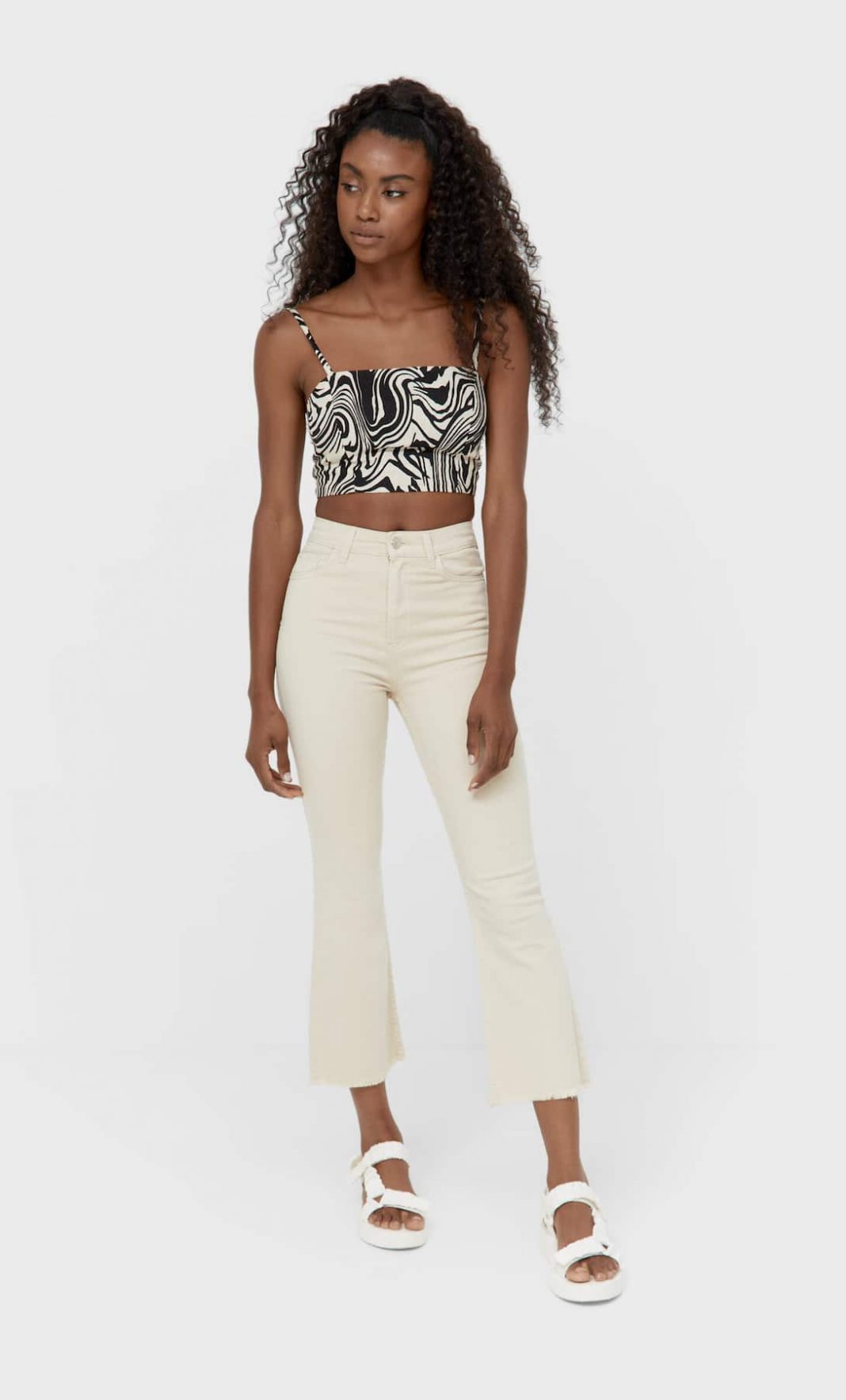 Quieres lucir este otoño con un pantalón diferente. Ven a las tiendas Stradivarius y pruébate el pantalón crop flare sarga. Confeccionado para la mujer de hoy, en tiro alto bajo acabado en estilo envase.
