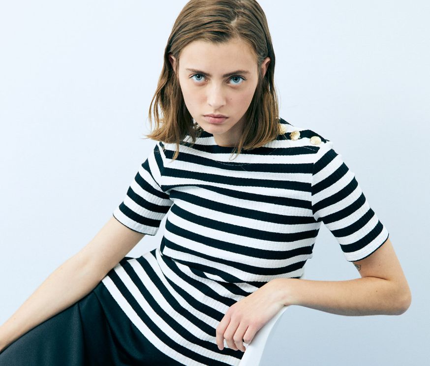Si lo tuyo son las camisetas que tengan un estampado de rayas, te recomendamos que te pases por cualquiera de las tiendas que Sfera tiene repartidas a lo largo del país y que le eches un vistazo a esta bonita prenda. Se trata de una camiseta que de manga corta que tiene unos bonitos detalles de botones dorados y un elegante cuello de caja. Su precio es de solo 7’99 euros.