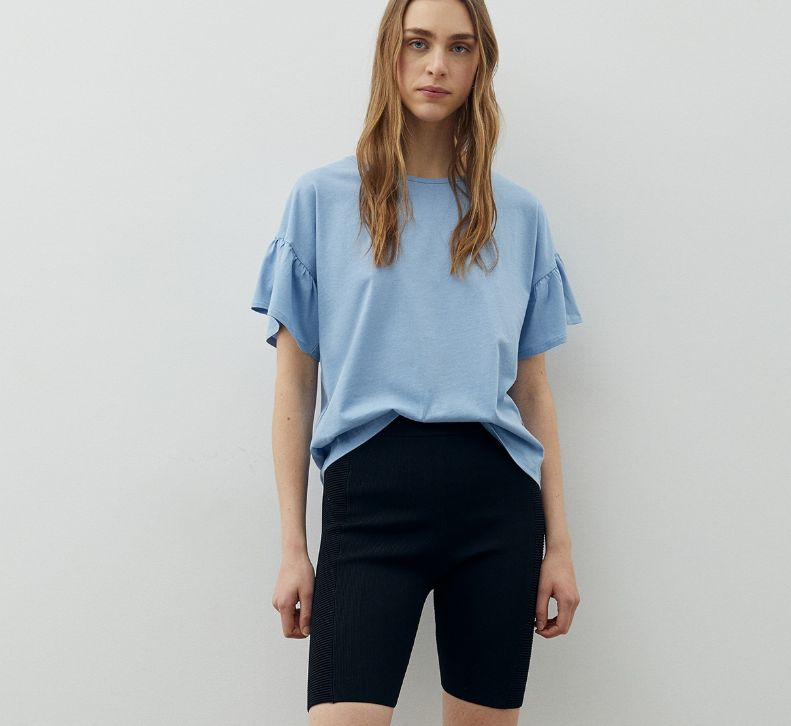 Si buscas una prenda que tenga un diseño original te recomendamos que eches un vistazo a esta. Se trata de una camiseta de Sfera que destaca sobre todo por su manga amplia con forma de volante. Pero también por tener un cuello tipo caja. Además de en color azul está disponible en cinco colores más. Su precio es de 2’35 euros.