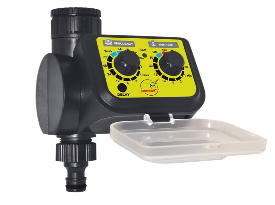 Este dispositivo permite programar cuándo se realizará el riego, con 110 posiciones distintas, frecuencia de riego de 1 hora a 1 semana, duraciones de 1 minuto hasta 1 hora, con electroválvula para riego o nebulización, e incluso riego superficial o gota a gota.