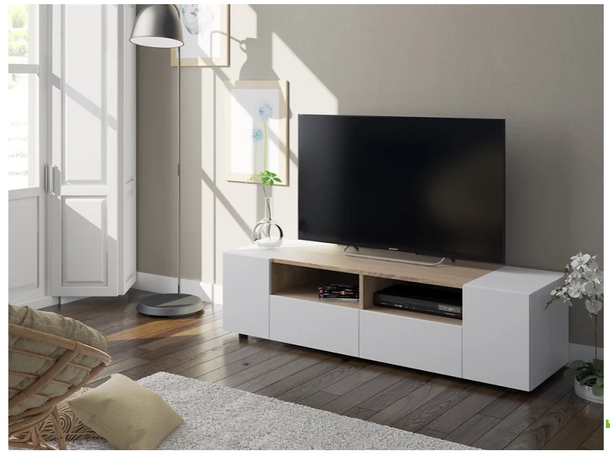 Funciona como un mueble para el salón, para colocar la TV, los reproductores, videoconsolas, etc. Con dos baldas y dos puertas para almacenar accesorios y objetos. Sus dimensiones son de 138x36x42 cm de ancho, alto y fondo respectivamente.