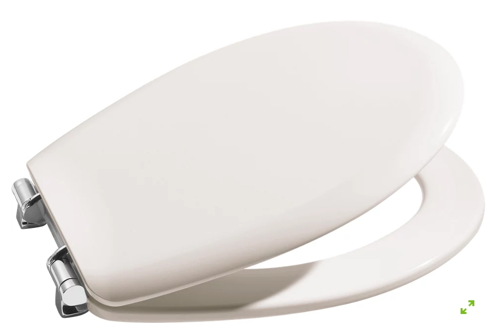 Una tapa de inodoro de calidad, con forma elegante y ovalada, fabricada en poliresina resistente, color blanco, bisagras de acero inoxidable, regulable, y con sistema de amortiguación para evitar que se caiga bruscamente.