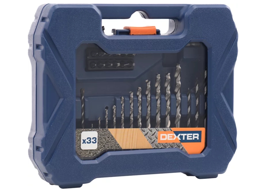 Un set de 33 brocas con diferentes grosores y para diferentes materiales. 11 son para taladrar metal, 4 de ellas para hormigón, otras 4 para madera, 12 puntas para atornilladores con soporte universal, así como un avellanador cónico con vástago de inserción hexagonal.