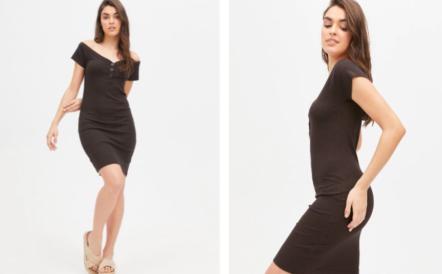 Seguimos ya en los 7,99 euros con este otro modelo de Inside, un vestido en canalé con escote bardot y botones en manga corta y con botones decorativos en el pecho. Está fabricado casi enteramente en algodón y se vende en color negro o rojo. Como ves es un modelo muy sexy, que se ajusta a la silueta pero suave y cómodo. Un vestido para cualquier ocasión que no hace honor a un precio tan bajo, así que aprovecha entrando aquí y comprarlo.